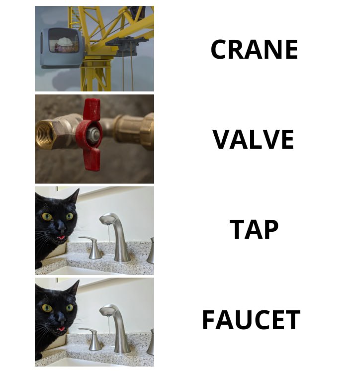 По идее в неё также входит и то, чем мы пользуемся на кухне и ванной. Однако от valve веет чем-то техническим; в быту водопроводный кран называют иначе. Британцы обычно говорят tap, американцы — faucet.